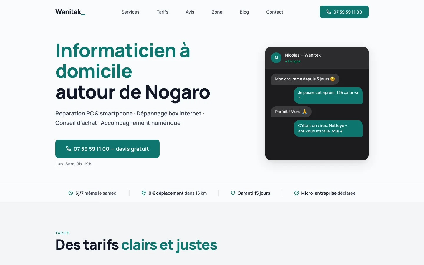 Si tu te reconnais dans la situation de Wanitek — un bon métier, des clients satisfaits, mais pas de présence en ligne — c’est exactement ce que je peux faire pour toi.